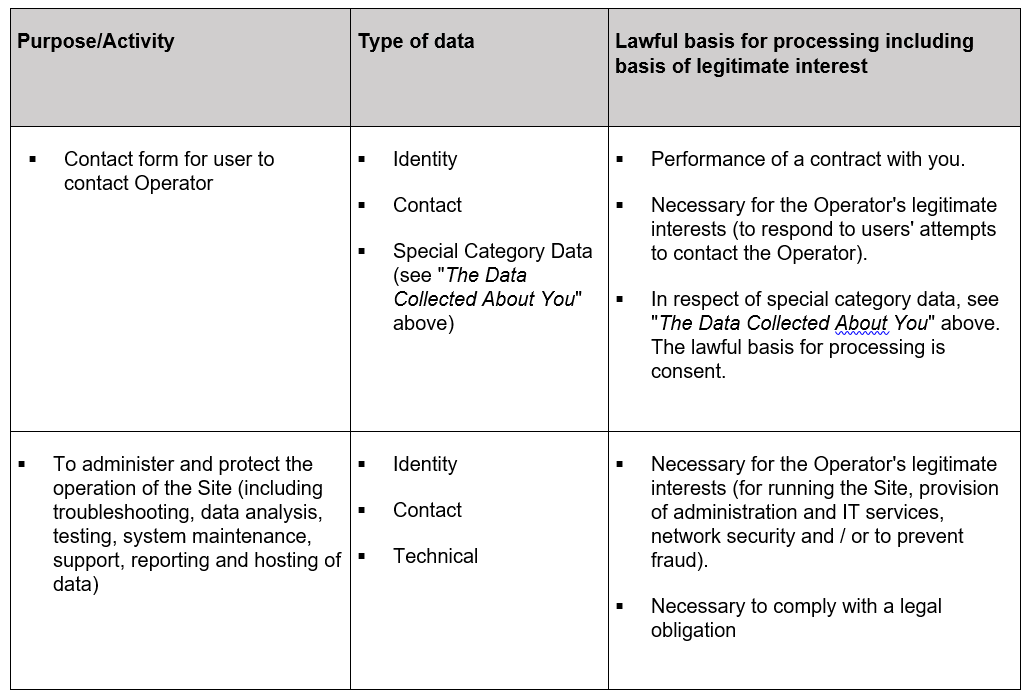 Set out below is a description of the ways the Operator may use your personal data, and which of the legal bases under the GDPR it relies on to do so. Also identified are the legitimate interests of the Operator for such use.